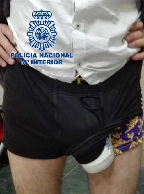 Контрабандист был остановлен и арестован в аэропорту в Испании, после выпуклости в штанах, которая явно бросалась в глаза. Позже как оказалось там вовсе было не крупное мужское достоинство а пакет с наркотиками.