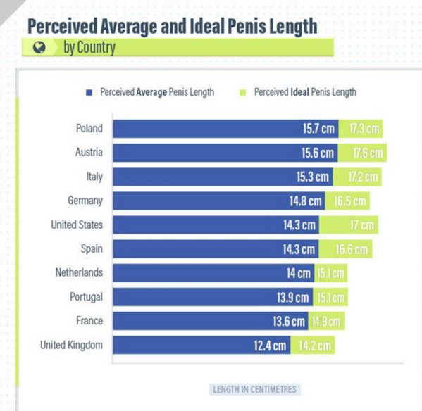 Польша – считает, что средняя длина пениса = 6,2 дюйма, а идеальная длина пениса = 6.8 дюймов
